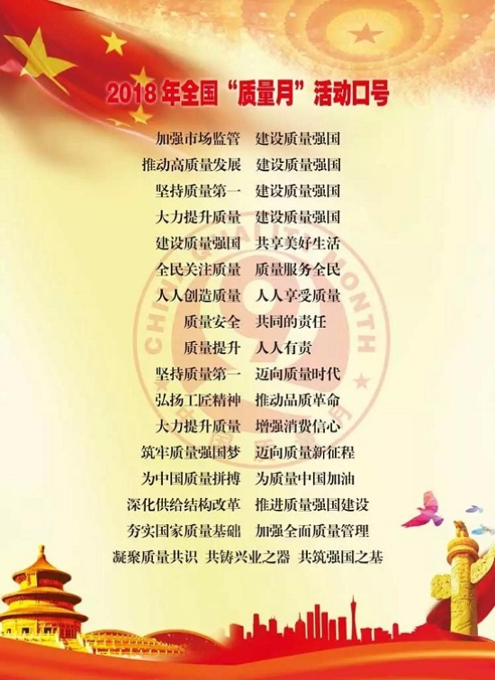 據介紹,中國航天科技集團、華為、海爾、重慶紅九九食品、名臣健康用品等1600餘家企業,作為各行業、各區域質量管理水平較高並在質量提升方面具有良好示範帶頭作用的代表,以“堅持質量第一,大力提升質量”為主題,聯合發出《2018年全國“質量月”企業質量誠信倡議書》。倡議企業界爭先做到弘揚工匠精神、推動質量提升,重視質量發展、造福人民群眾,發揮標準引領、打造中國質量。