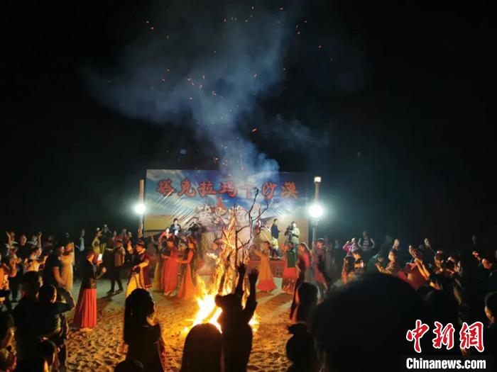 沙漠點燃篝火晚會,遊客們載歌載舞,一片熱鬧景象。 趙丹丹 攝