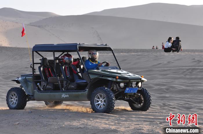 沙漠越野車載客在沙海衝浪。 王斌銀 攝 直升機空中俯瞰敦煌大漠美景。 王斌銀 攝 夕陽西下,遊客騎駱駝暢遊鳴沙山,欣賞敦煌大漠秋景。 王斌銀 攝 上千匹駱駝載遊客暢遊鳴沙山,形成長約2公里的環形長隊。 王斌銀 攝