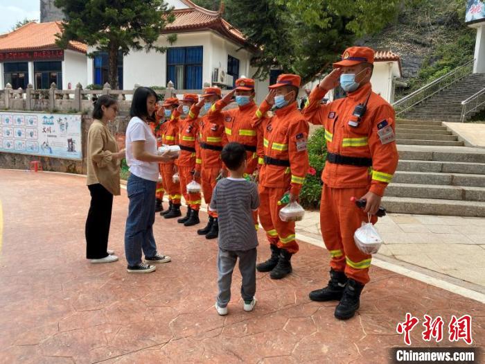在通往紫帽山防火檢查站卡點位置,發現一名小女孩在家長的帶領下,手裡握着2瓶冰紅茶飲料,小聲害羞地說著“消防員叔叔,你們辛苦了”。正在執勤的消防員幾次推辭,拗不過小女孩的堅持,敬禮致謝。小女孩的這一舉動如一縷山間的涼風讓正在執勤的消防員收穫滿滿的感動。