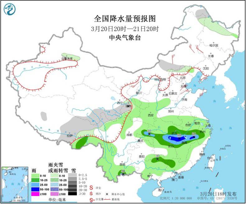 3月20日20時至21日20時,內蒙古中部、黑龍江北部、新疆沿天山地區、青藏高原東部、甘肅中部等地部分地區有小到中雪或雨夾雪。江漢東南部、江南北部、華南北部、四川盆地東部、雲南南部等地部分地區有中到大雨,其中,湖南東北部、江西北部等地部分地區有暴雨(50~80毫米)。內蒙古大部、吉林西部、遼東半島、河北東部和北部、山東北部和東部等地部分地區有4~6級風(見圖1)。