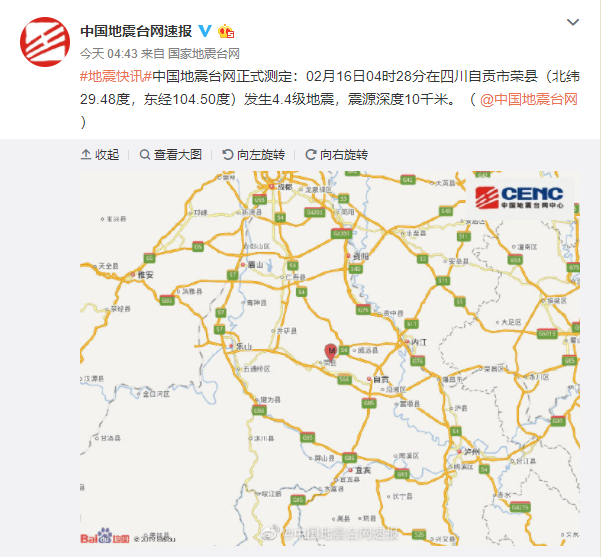 人民網北京2月16日電 中國地震台網正式測定:02月16日04時28分在四川自貢市榮縣(北緯29.48度,東經104.50度)發生4.4級地震,震源深度10千米。