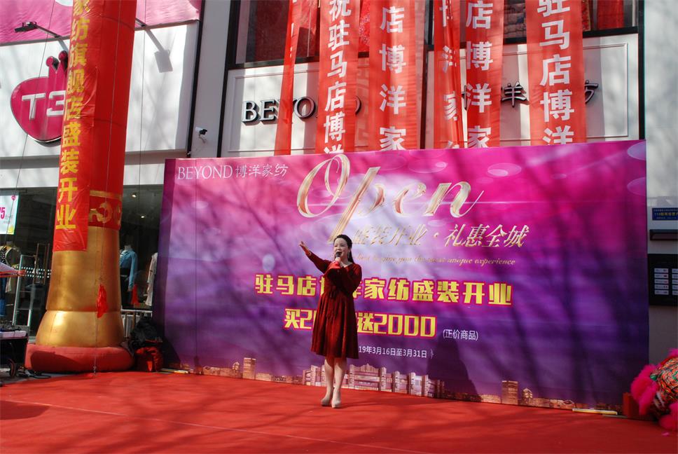 舞獅、戰鼓、歌曲、薩克斯演奏,舞蹈先後登台暖場。主持人在節目表演間隙做產品推介並與觀眾互動。 博洋家紡河南分公司總經理趙偉豪首先致辭:豫州之腹地,天下之最中。盤古開天地,梁祝寫傳奇。自古以來人傑地靈的駐馬店都在中原大地書寫着屬於自己的傳奇。而這片熱土上的人民更是熱愛美好生活。博洋家紡就是幸福生活點睛品,潘總經過多方考察最終選定加盟博洋家紡。經過四個多月的精心準備,在這個春暖花開的好季節、二月初十的吉日吉時,迎來了隆重開業的時刻! “快馬傳書古驛道,幸福生活譜新篇。”深得消費者喜愛的博洋家紡自1958年創立以來,是國內第一個完整提出家紡概念的家紡品牌,一直以來就有“中國人的家紡從博洋開始”的美譽! 博洋家紡樂山大道旗艦店裝修美輪美奐、引入全套德國洗滌、熨燙設備,不但將引領行業潮流的優質的產品提供給廣大駐馬店人民,更把洗滌、熨燙、婚房布置等免費優質特色服務帶進駐馬店人民更高品質的美好生活中。 我相信英姿颯爽的駐馬店團隊也將以樂山大道旗艦店為起點,在潘總的帶領下用更加飽滿的熱情和更加努力的工作,讓更多駐馬店人民早日享受博洋家紡帶來的更好的產品、更優的服務,早日實現博洋家紡品牌在駐馬店的大發展! 駐馬店博洋家紡董事長張新國對參加慶典的來賓表示感謝。他說:駐馬店博洋家紡店雖然剛剛成立,在同行業中也許名不見經傳,但我們博洋家紡是國內家紡行業十大名牌之一,有各位領導、朋友的厚愛與支持,我們全體員工充滿信心和希望。我們將認真遵守黨和國家的各項方針政策,以“對消費者負責、讓消費者放心”的經營理念,堅決做到守法經營、誠信經營、按章納稅,積極參與市場競爭,切實加強管理,不斷提升服務。今天只是博洋家紡的起點,今後的路還很長,在這裏懇請大家一如既往地給予關心和指導,使駐馬店博洋家紡店有朝一日成為家紡業的名店。 上午10時18分,在禮花禮炮聲中,博洋家紡銷售管理中心總經理張樺、博洋家紡河南分公司總經理趙偉豪、博洋家紡招商中心總監王愛軍、駐馬店博洋家紡董事長張新國、駐馬店博洋家紡總經理潘巧、駐馬店市亮劍文化傳媒有限公司董事長、天中亮劍網總編袁峰上台剪綵。 駐馬店博洋家紡董事長張新國、博洋家紡銷售管理中心張樺共同為舞獅點睛。點睛諧“點金”,寓言博洋家紡開業大吉、財源滾滾來。