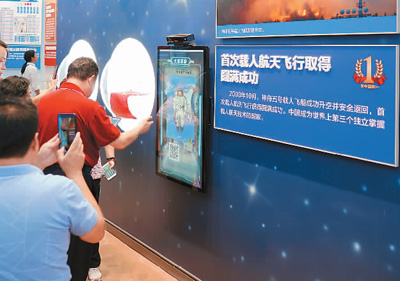 首次載人航天飛行取得圓滿成功的展示區域,觀眾在电子設備上體驗“太空遨遊”。 |