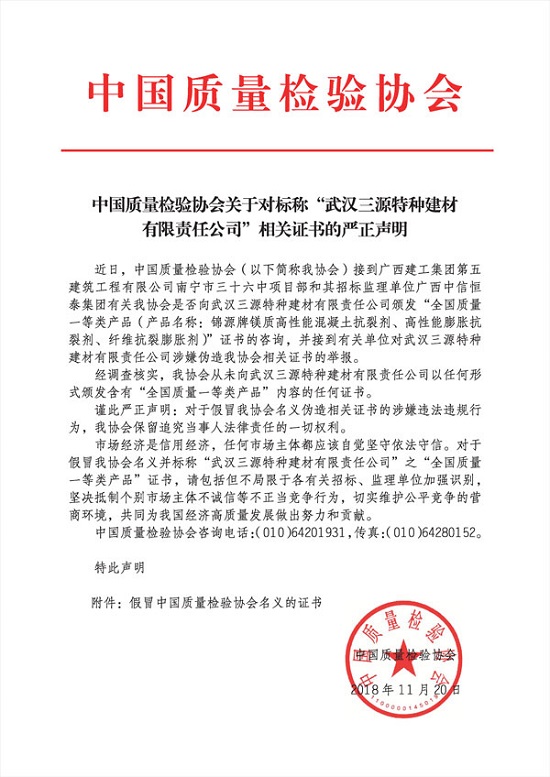 近日,中國質量檢驗協會(以下簡稱我協會)接到廣西建工集團第五建築工程有限公司南寧市三十六中項目部和其招標監理單位廣西中信恆泰集團有關我協會是否向武漢三源特種建材有限責任公司頒發“全國質量一等類產品(產品名稱:錦源牌鎂質高性能混凝土抗裂劑、高性能膨脹抗裂劑、纖維抗裂膨脹劑)”證書的諮詢,並接到有關單位對武漢三源特種建材有限責任公司涉嫌偽造我協會相關證書的舉報。