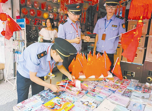 鷹潭市市場監管執法人員在國慶前夕檢查市場上的國旗質量。 楊敏英/攝